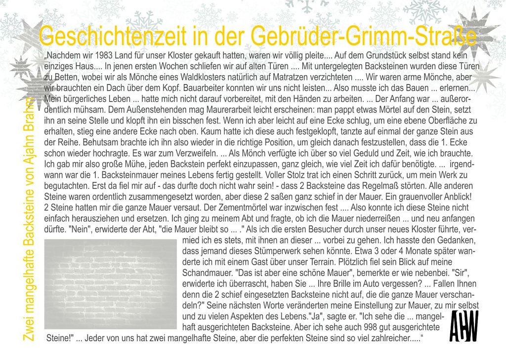 2 Steine hatten mir die ganze Mauer versaut. Der Zementmörtel war inzwischen fest.... Also konnte ich diese Steine nicht einfach herausziehen und ersetzen. Ich ging zu meinem Abt und fragte, ob ich die Mauer niederreißen... und neu anfangen dürfte. "Nein", erwiderte der Abt, "die Mauer bleibt so.... " Als ich die ersten Besucher durch unser neues Kloster führte, vermied ich es stets, mit ihnen an dieser... vorbei zu gehen. Ich hasste den Gedanken, dass jemand dieses Stümperwerk sehen könnte. Etwa 3 oder 4 Monate später wanderte ich mit einem Gast über unser Terrain. Plötzlich fiel sein Blick auf meine Schandmauer. "Das ist aber eine schöne Mauer", bemerkte er wie nebenbei. "Sir", erwiderte ich überrascht, haben Sie... Ihre Brille im Auto vergessen?... Fallen Ihnen denn die 2 schief eingesetzten Backsteine nicht auf, die die ganze Mauer verschandeln?" Seine nächsten Worte veränderten meine Einstellung zur Mauer, zu mir selbst und zu vielen Aspekten des Lebens."Ja", sagte er. "Ich sehe die... mangelhaft ausgerichteten Backsteine. Aber ich sehe auch 998 gut ausgerichtete Steine!"... Jeder von uns hat zwei mangelhafte Steine, aber die perfekten Steine sind so viel zahlreicher.....