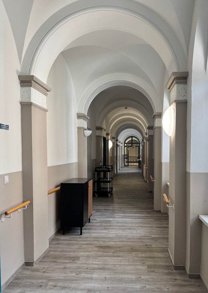 Seit 2015 wird die Brandschutzertüchtigung des Baudenkmals geplant und seit 2017 sukzessive umgesetzt. Einen Schwerpunkt bildeten die Errichtung der 2 Außentreppen aus Stahl für den 2. baulichen Flucht- und Rettungsweg, einen anderen die Installation von Brand- und Rauchschutztüren zum Abschluss der beiden Treppenhäuser von den Bewohnbereichen. Im Zusammenhang mit den beiden Außentreppen wurden Bewohnerbereiche verändert und deren Bäder weitestegehend barrierefrei mit bodengleichen Duschen modernisiert.